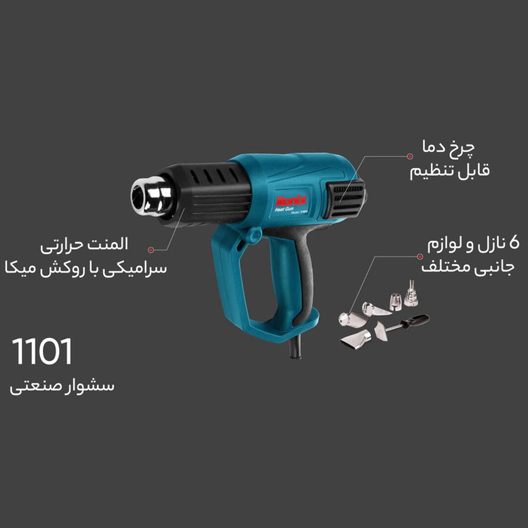 سشوار صنعتی برقی 1101 رونیکس، انتخابی مطمئن در مصارفی نظیر رنگزدایی، اتصالات، انقباض PVC، جوشکاری و انحنادادن به قطعات پلاستیکی، خشککردن و رنگزدایی است. این دستگاه کاربردی، با برخورداری از موتور 2000 وات قدرتمند، دارای تنظیمات نهگانه دما و حجم هوای خروجی است تا نیازهای مختلف کاربران را برآورده کند. سیستم اُورلود یا محافظ اضافه بار، در صورت بالاتررفتن درجه حرارت دستگاه از حد تعیینشده، جریان الکتریکی را قطع میکند و تا بازگشت دما به حالت قبل، جریان برقرار نمیشود. این روند از آسیب، سوختن و خطرات احتمالی جلوگیری کرده و به کاربر امکان میدهد تا با دقت بالایی کارها را به اتمام برساند. سشوار صنعتی 1101 رونیکس، ارگونومیک، کمحجم و سبکوزن طراحی شده تا کاربران بتوانند ساعتهای متمادی از آن استفاده کرده و در پایان به نتیجه دلخواه دست یابند. سشوار 1101 به همراه یک کیف BMC و سری های مرتبط عرضه می شود .