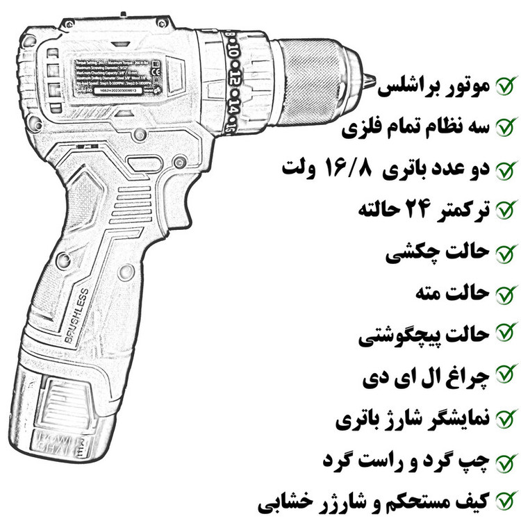 دریل چکشی موتور براشلس شارژی 16.8 ولت ویوارکس مدل VR1682H-BL دارای موتوری قدرتمند است که میتواند به حداکثر دور موتوری برابر با 1800 دور بر دقیقه در حالت آزاد دست پیدا کند. تورکمتر 24 به اضافه حالت حالت چکشی، پیچگوشتی و مته که روی سه نظام دستگاه تعبیه شده به کاربران این امکان را میدهد که از پس هر سوراخ کاری بر بیاید و بنا به موقعیت بتوانند از قدرتهای متفاوت این دریل شارژی قدرتمند استفاده کنند. و دکمه ی مجزا 2 سرعته تعبیه شده برای این محصول کاربران را قادر میسازد تا با توجه به نیاز خود بتوانند سرعت و قدرت گردش این دریل را تنظیم نمایند. به تمامی امکاناتی که اشاره شد کلید گازی این محصول برای تنظیم سرعت را اضافه کنید و کلید تغییر حالت گردش چپگرد-راستگرد تعبیه شده برای این محصول به کاربران کمک میکند تا بدون هیچ مشکلی به باز و بستن پیچها و سوراخکاری در متریالهای مختلف بپردازد. از دیگر مزایای این محصول میتوان به نمایشگر شارژر باطری روی بدنه و چراغ ال ای دی برای روشن کردن محل سوراخکاری و داشتن 2 باتری لتیومی 16.8 ولت (تولید سال 2024 میلادی) و شارژر خشابی اشاره کرد. سه نظام تعبیه شده برای این محصول از نوع تمام فلززی اتوماتیک با سایز 10 میلیمتری بوده که با دقت بالایی ساخته شده است همچنین وجود یک کیف مستحکم BMC مخصوص پرتابل عرضه میگردد، تا کاربران نگرانی بابت صدمه دیدن محصول برای حمل و جابه جایی نداشته باشند.