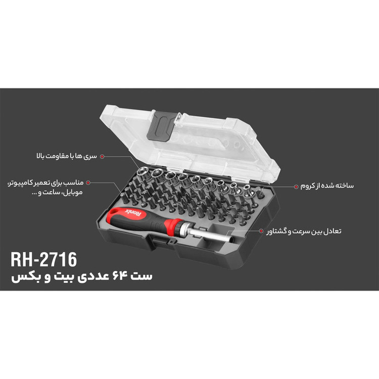 ست 64 عددی سری بیت و بکس رونیکس مدل RH-2716، مجموعهای کاربردی از سریهای پیچ گوشتی دوسو، سریهای پیچ گوشتی چهارسو، سریهای پیچ گوشتی ستارهای، سریهای پیچ گوشتی چهارسو خاردار، سریهای آلنی و سریهای بکس میباشد.