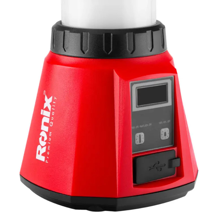 بدنه این چراغ کار رونیکس از پلیمر تقویت شده ABS، TPR و آلومینیوم ساخته شده و با درجه حفاظت IP44 در برابر رطوبت و گردوغبار محافظت دارد. طراحی ۳۶۰ درجه، روشنایی یکنواخت و کابل شارژ ۱ متری از دیگر ویژگیهای این چراغ کار است.