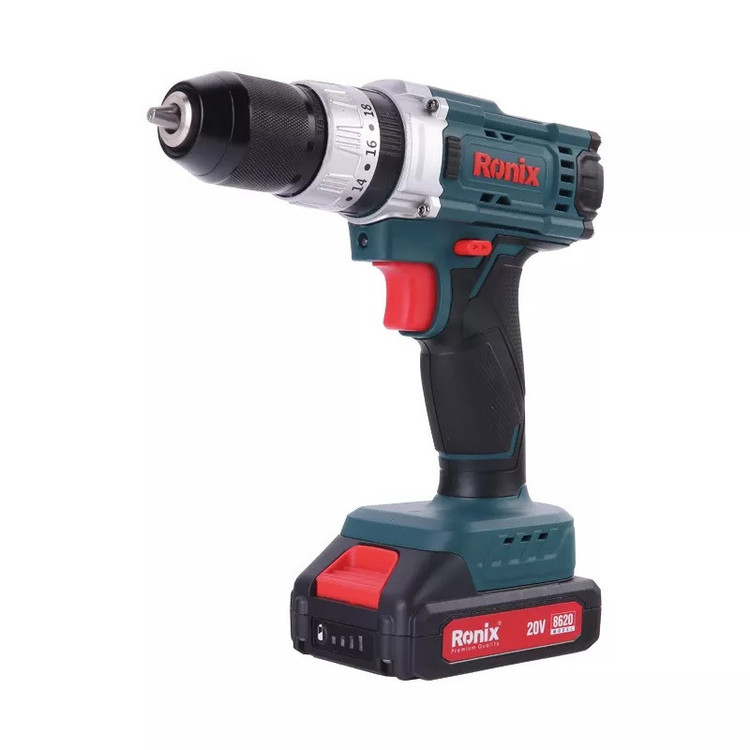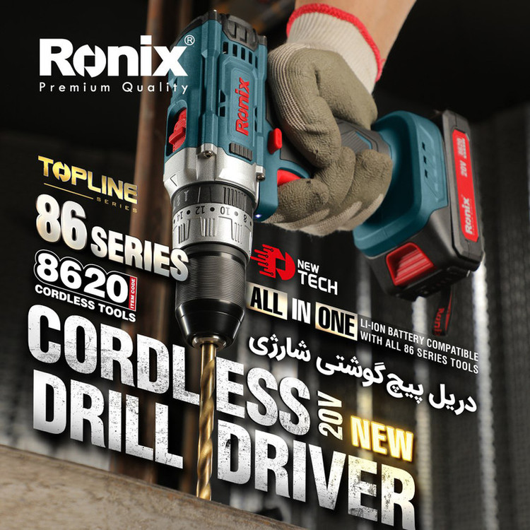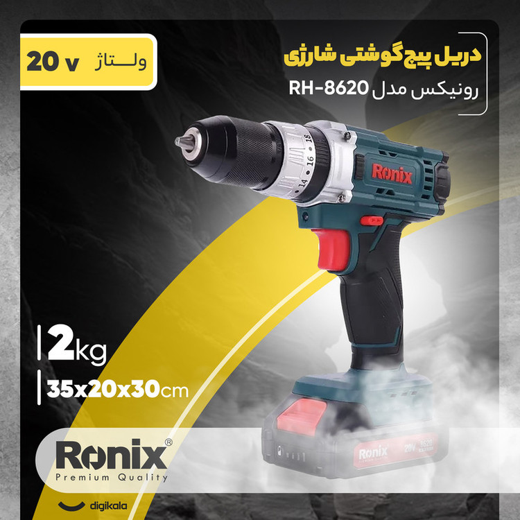 دریل پیچ گوشتی چکشی شارژی ترکمتردار دو سرعته 20 ولت رونیکس با مدل 8620، مجهز به موتور قدرتمند و کارآمد است. کاربران میتوانند از این محصول برای سوراخکاری، پیچکاری و سوراخکاری چکشی مواد و مصالح مختلف استفاده کنند.