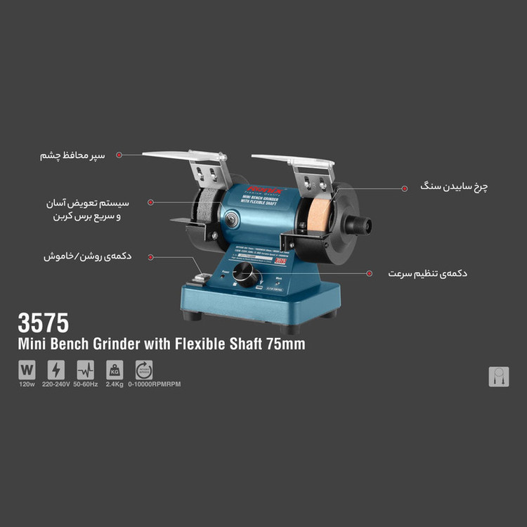 سنگ فرز رومیزی 3575 رونیکس دارای ابعاد کوچک، جمعوجور، کمحجم با یک موتور قدرتمند 120 واتی است. تنظیم سرعت در محدودهی صفر تا 10000 دور بر دقیقه در این ابزار امکانپذیر است. این سنگ فرز، نیازهای مشاغل مختلف مانند صنایع چوب، جواهرسازی، دندانسازی و کارهای فنی خانگی را به خوبی تامین میکند.