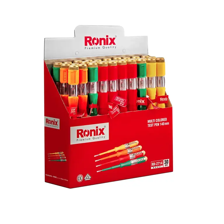 محصول رونیکس مدلRH-2714 ، یک فازمتر 14 سانتیمتری دارای میله سختکاریشده فولادی و مقاوم به ضربه بوده و نوک آن با فلز نیکل آبکاری شده است. این فازمتر، مجهز به لامپ نئون داخلی پرنور برای کار در روشنایی روز و محیطهای پرنور است.