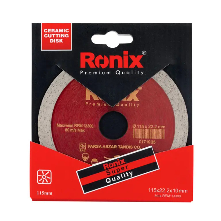 برای ایجاد برشی سریع و دقیق روی سرامیک باید صفحه برشی در اختیار داشت که ابعاد آن مطابق با استانداردهای جهانی تنظیم شده باشد. این صفحه سرامیکبر رونیکس دارای قطر 115 میلیمتری، ارتفاع سگمنت 10 میلیمتری و قطر سوراخ وسط 22.2 میلیمتری است. تمام این موارد، در کنار سرعت چرخشی بالغ بر 13300دور در دقیقه این صفحه سرامیکبر را به عنوان محصولی نمونه به بازار ابزار ایران و جهان معرفی کرده است.