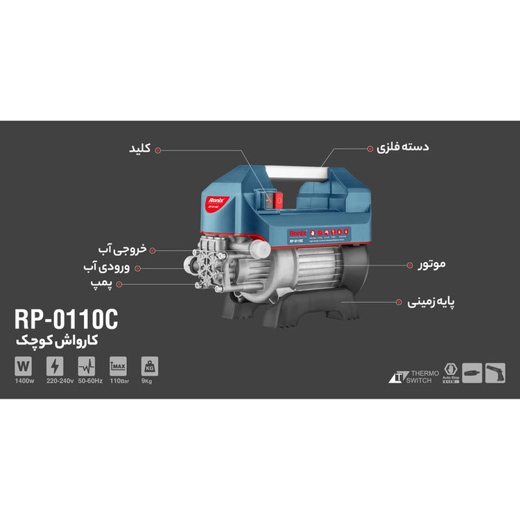 کارواش RP-0110C رونیکس با بهره مندی از موتور القایی (Induction) قدرتمند و نیز با توان 1400 وات، امکان دستیابی به حداکثر فشار آب خروجی معادل با 110 بار و حداکثر جریان آب خروجی به میزان 6 لیتر در دقیقه را برای کاربر فراهم آورده است. این موتور به کاربر اطمینان خاطر می دهد که فرایند شست وشو، تمیزکاری و لایه بردای با قدرت بالا و بدون کاهش یا قطع شدن جریان آب ادامه خواهد داشت.یکی از کاربردی ترین سیستم ها در کارواش سیستم سوئیچ اتو استاپ است. نحوه عملکرد اتو استاپ به این صورت است که با فشار دادن ماشه آبپاشی موتور به کار می افتد و با رها کردن این ماشه موتور متوقف می شود. این فرایند تأثیر به سزایی در افزایش طول عمر موتور دارد و همچنین باعث صرفه جویی در مصرف آب و انرژی می شود.کارواش RP-0110C با برخورداری از سیستم سوئیچ اتو استاپ این امکان را به کاربر می دهد که با خیالی آسوده و مطابق با نیاز خود از این دستگاه برای انجام تمیزکاری و زنگار زدایی بهره ببرد.یکی دیگر از مهمترین سیستم هایی که یک کارواش را متمایز می کند، بهره بردن از سیستم حفاظت گرمایی است که در صورت افزایش دمای دستگاه به طور خودکار موتور را خاموش می کند و از این طریق از استهلاک قطعات داخلی آن جلوگیری به عمل می آورد. این فرایند همچنین در افزایش طول عمر موتور نیز تأثیر به سزایی دارد.کارواش RP-0110C رونیکس از آن دسته ابزارآلاتی است که با بهره مندی از سیستم حفاظت گرمایی، سالیان بسیاری را در کنار کاربر خواهد بود و با توانمندی های خود او را در انجام فعالیت های مختلف مربوط به تمیزکاری همراهی خواهد کرد.شاید بتوان گفت طراحی اولین حرف را در تولید ابزار می زند، زیرا این ویژگی یکی از اولین پارامترهای مهم در نگاه کاربران است. RP-0110C با برخورداری از طراحی ارگونومیک و وزن 9 کیلوگرمی که باعث سهولت در انتقال دستگاه می شود، به کاربر این اجازه را می دهد که در هر محیط و شرایطی به راحتی از این ابزار استفاده کند. به علاوه RP-0110C دارای دسته ای ارگونومیک است که حمل و نقل آن را آسان کرده است و با برخورداری از پایه ای محکم به خوبی بر روی سطوح قرار می گیرد. نازل این دستگاه قابلیت تنظیم داشته و استفاده از کارواش را در مصارف گوناگون امکان پذیر می کند.