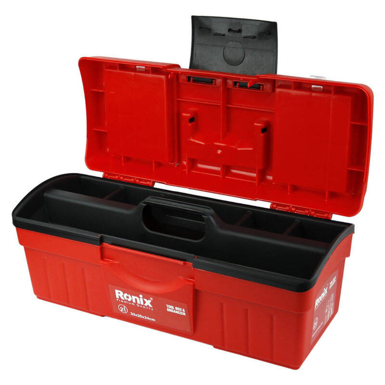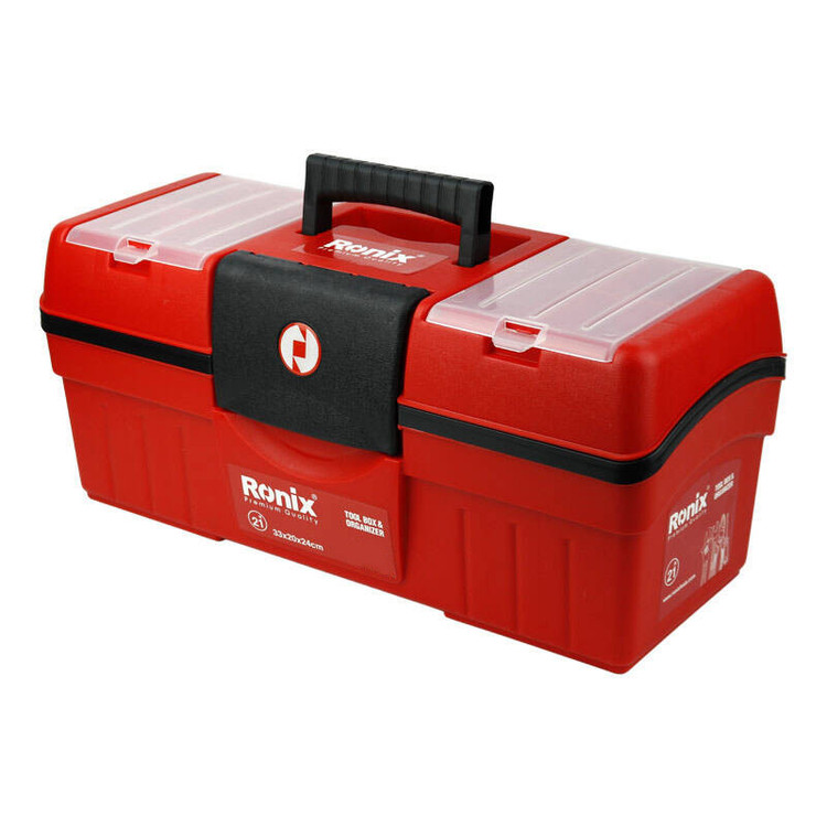 جعبه ابزار نشکن رونیکس 21 اینچی تولید شده از مواد اولیه با کیفیت و همچنین بدنه مقاوم و نشکن جهت کاربری های طولانی مدت می باشد . طراحی منحصر به فرد در قسمت بندی های روی درب جعبه ابزار و نهایت کیفیت در اتصال اجزای مختلف می باشد . همچنین مجهز به لولاهای بادوام و مجهز به سینی پلاستیکی برای نگه داشتن آچار، چکش و ابزارهای بلند و مجهز به قفل پلاستیکی مقاوم و روان میباشد و همچنین این محصول ساخت کشور ایران می باشد . سایز این محصول در محصولات رونیکس بزرگترین سایز جعبه ابزار میباشد و سایز 21 اینچ می باشد .طراحی قفل این جعبه بسیار محکم و با کیفیت می باشد .