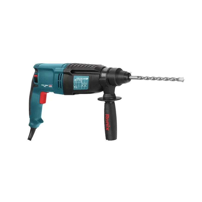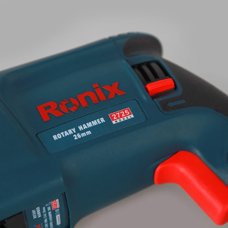 بتن کن برقی رونیکس مدل 2725 یکی از نمونههای با کیفیت و قدرتمند موجود در بازار کشور است. این دستگاه دارای موتور قدرتمند 850 واتی است که به آن این امکان را داده تا بتواند انواع سطوح و قطعات اعم از سنگ، چوب و فلز را چکشکاری یا سوراخکاری کند.بتن کن 2725 رونیکس سه حالت عملکردی دارد: حالت سوراخکاری، حالت چکشی و حالت همزمان سوراخکاری و چکشی. بر روی بدنهی این ابزار، یک سوئیچ سه وضعیته تعبیه شده که با چرخاندن آن میتوان وضعیت دستگاه را بر روی یکی از حالات فوق قرار دارد. وجود این سه وضعیت، کارایی دستگاه را تا حد زیادی بالا برده و به کاربر این امکان را داده تا بنا به نوع کار خود، از دستگاه برای چکشکاری یا سوراخکاری استفاده کند.این محصول رونیکس، توان مناسبی در وارد کردن نیرو به سطح کار دارد. حداکثر سرعت گردش بتن کن سه کاره رونیکس به 1200 دور در دقیقه میرسد و قادر است در هر دقیقه، حداکثر 5500 ضربه با انرژی 3.5 ژول به سطح کار وارد کند. متههای مناسب این دستگاه متههای با سایز 150× 7، 150× 8، 150× 10 و 150× 12 میلیمتر هستند.سیستم مته گیر این دریل بتن کن، به صورت SDS-Plus است و برای متههایی مناسب است که دنباله یا متهگیر آنها 4 شیار است. این قسمت مته گیر رونیکس روکش پلاستیکی دارد تا هم دوام آن افزایش یاید و هم تعویض مته، به شکلی سریع و راحت انجام شود.