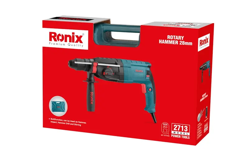 - دریل بتنکن پرقدرت با ۴ عملکرد: سوراخکاری، سوراخکاری ضربهای، قلمزنی و تنظیم موقعیت قلم دسته کمکی ۳۶۰ درجه با طراحی Ronix دکمه قفل کلید برای راحتی کار در عملیات مداوم مفصل توپ محافظ کابل برای آزادی حرکت بهینه هنگام کار سیستم کلاچ ایمنی برای محافظت بالا