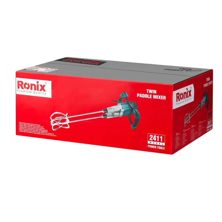 میکسر برقی دومحوره 2411 رونیکس ترکیبی از قدرت و چرخش برای مخلوط کردن هر نوع مصالح ساختمانی، مواد شیمیایی، ملاتهای با چگالی و غلظت بالا، رنگ، گچ، پرکنندههای ساختمانی و غیره است. این ابزار با دو تیغۀ همزن، مخلوط ایدهآل و یکدستی در اختیارتان میگذارد. گیربکس دوسرعته صنعتی این میکسر نیز به شما کمک میکند تا مواد مختلف را در کاربریهای قدرتی یا سرعتی با هم مخلوط کنید.