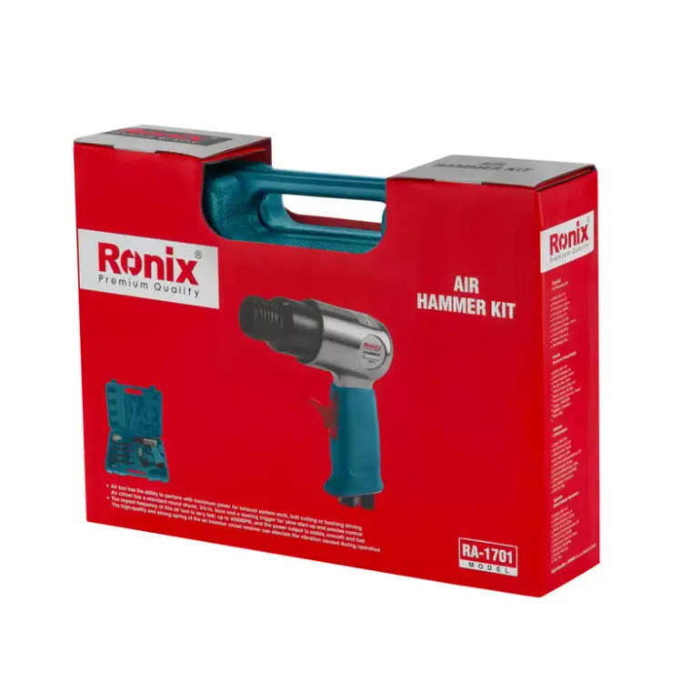 کیت چکش بادی RA-1701 رونیکس انتخاب مناسبی برای کارهای سنگین مانند کندهکاری، تراشدادن، برش فلزات، سربارهگیری جوش، جازدن بوش و ... است. این ابزار قدرتمند و کارآمد، فرکانس ضربهای بسیار بالا تا ۴۵۰۰ ضربه بر دقیقه را ایجاد میکند و عملکردی روان، پایدار و سریع دارد. سیلندر آلیاژی مستحکم و پیستون سختكاريشده و حرارتديده با كورس بالا باعث میشود که این چکش دوام و کارایی قابل توجهی داشته باشد.