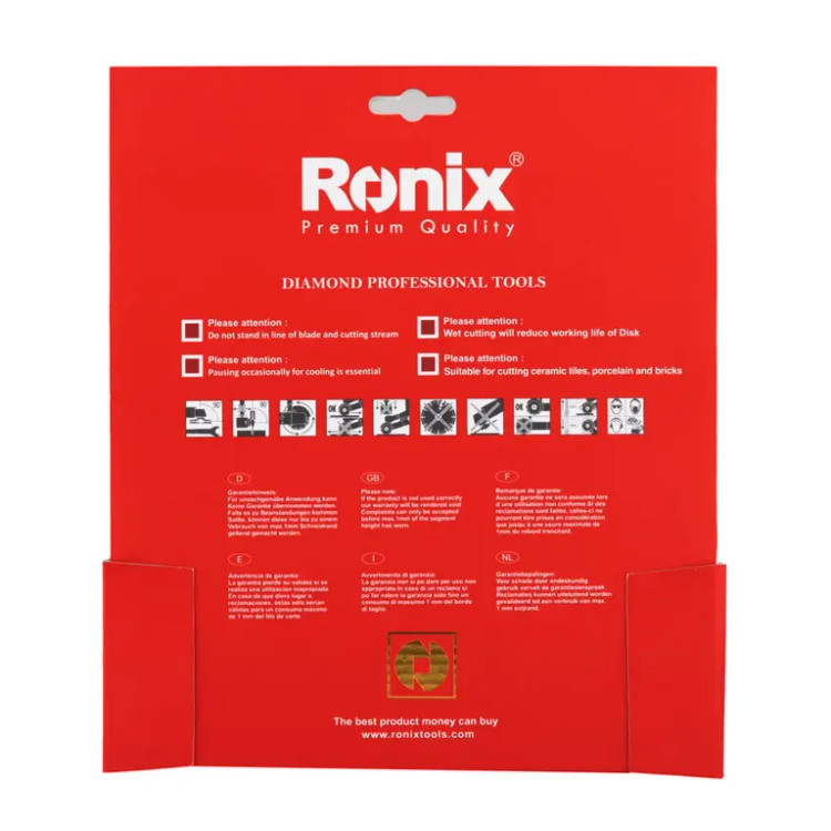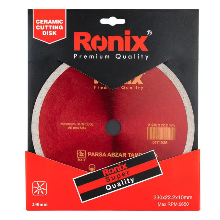 این صفحه سرامیکبر رونیکس دارای قطر 230 میلیمتری، ارتفاع سگمنت 10 میلیمتری و قطر سوراخ وسط 22.2 میلیمتری است. تمام این موارد، در کنار سرعت چرخشی بالغ بر 6650 دور در دقیقه، این صفحه سرامیکبر را به عنوان محصولی نمونه به بازار ابزار ایران و جهان معرفی کرده است.